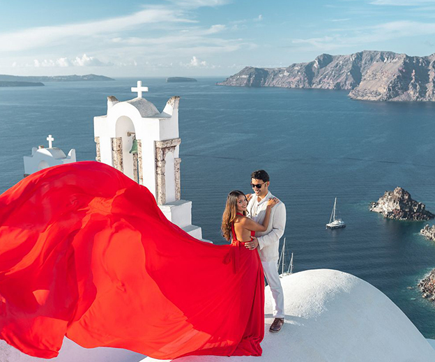 Book a private flying dress photoshoot proposal on the best Santorini locations and will be a reminder of these charming photos years. Starting Price 450 €